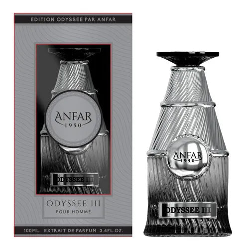 Odyssee III de Anfar 1950 es una fragancia de la familia olfativa Aromática Fougère para Hombres. Odyssee III se lanzó en 2023. La Nariz detrás de esta fragrancia es Ahmedullah Anfar. Las Notas de Salida son abrótano, bergamota, cardamomo, menta y pimienta rosa; las Notas de Corazón son notas verdes, geranio, lavanda y vetiver; las Notas de Fondo son haba tonka, Amberwood y vainilla. Concentración Extracto de Perfume, en envase de 100ml.